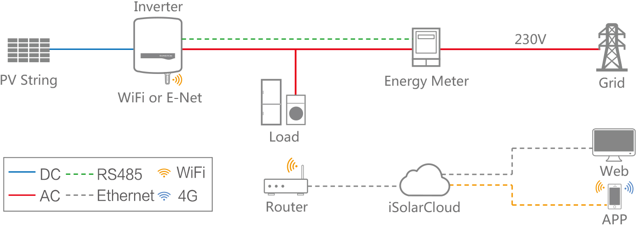 เนื่องจากพลังงานไฟฟ้าที่ผลิตได้จากแผงโซลาร์เซลล์เป็นรูปแบบ DC จึงจำเป็นต้องมีการแปลงเป็นรูปแบบ AC ผ่านอินเวอร์เตอร์ ซึ่งอินเวอร์เตอร์ชนิดนี้ มีช่องการเชื่อมต่อไม่เยอะมาก โดยช่องหลักจะเป็นส่วนของแผงโซลาร์เซลล์ขาเข้า (Input) และส่วนของสายไฟขาออก (Output) จะต่อร่วมเข้ากับตู้ Consumer ของบ้าน เพื่อจ่ายไฟฟ้าเข้าสู่ระบบร่วมกับระบบกริดของการไฟฟ้าฯ อินเวอร์เตอร์จะมีอุปกรณ์ร่วมเพื่อป้องกันไฟย้อนเข้าสู่ระบบ เป็นลักษณะอุปกรณ์ CT คล้องกับสายไฟขาเข้าของกริด (Zero export controller) และมีสายสัญญาณ RS-485 ต่อเข้าไปที่อินเวอร์เตอร์ เพื่อเป็นการตรวจจับและตัดไฟไม่ให้ย้อนเข้าสู่ระบบ ในอินเวอร์เตอร์บางรุ่น จะมีตัวปล่อยสัญญาณ WiFi เพื่อให้ผู้ใช้งานสามารถตรวจสอบการทำงานของระบบแบบ Real-time ได้อีกด้วย